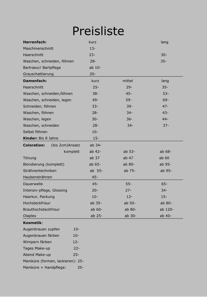 Unsere Preise richten sich nach der Haarlänge und dem Arbeitsaufwand